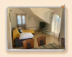 Stan u potkrovlju veličine 74m2, dvije dvokrevetne sobe od kojih je jedna sa svojim WC + tuš kabina. Dnevni boravak, blagavaona i kuhinja, te jedan dodatni WC s tušem + perilica robe. U kuhinji se nalaze hladnjak/zamrzivač, keramička ploča za kuhanje, ugradbena pečnica te perilica suđa. U dnevnom boravaku se nalazi kutna garnitura s mogućnošću razvlačenja u dvokrevetni ležaj. Terasa preko 20m2 dijelom natkrivena. |